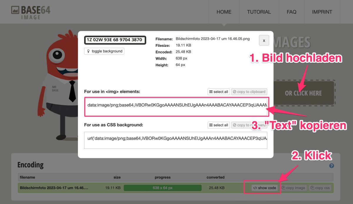 Das Bild muss "in Text" umgewandelt werden. Dies geht zum Beispiel mit folgendem Online-Tool: www.base64-image.de