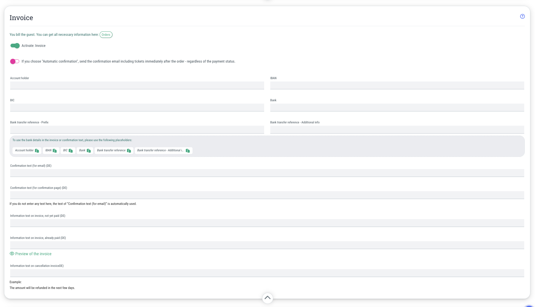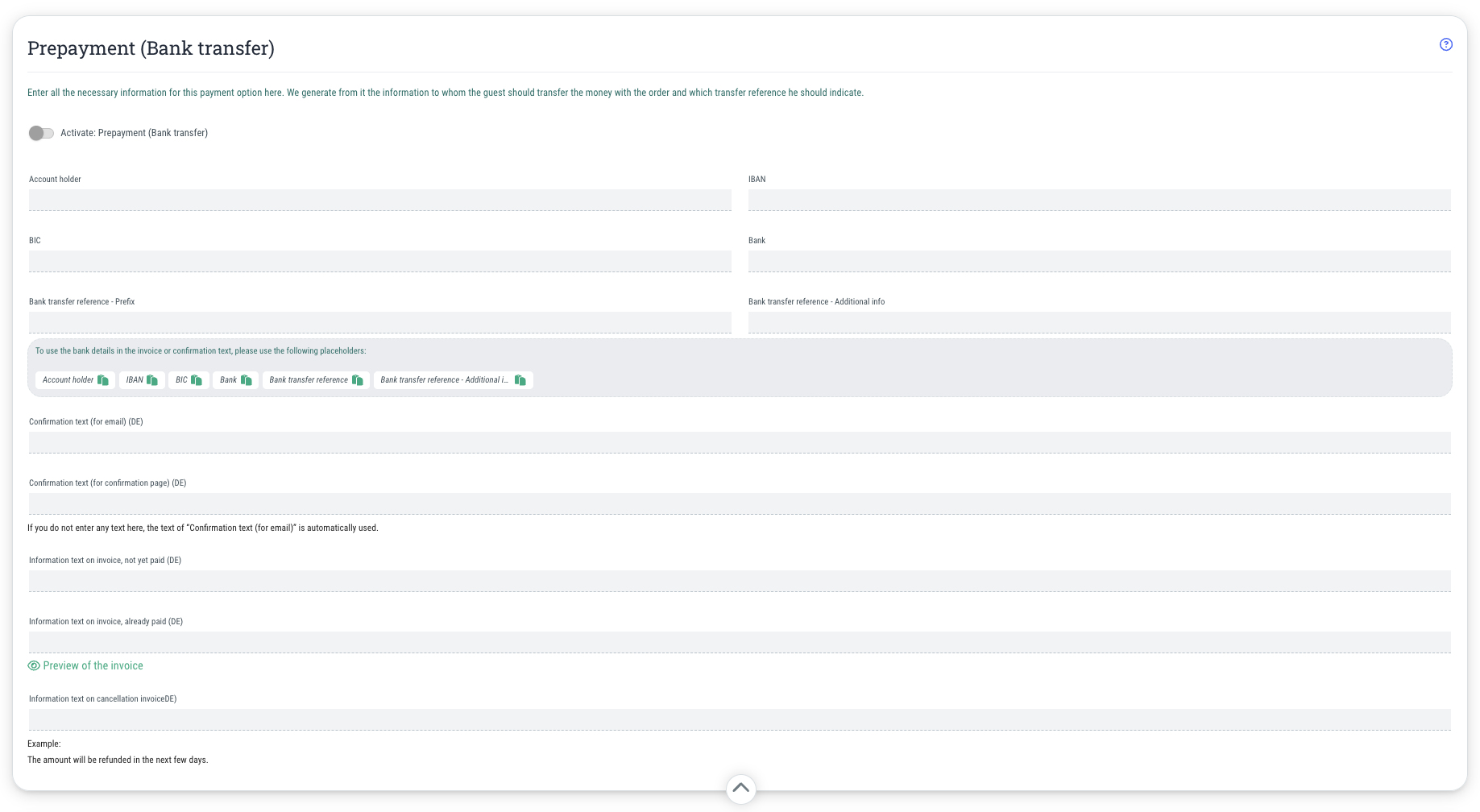 Important: Once these settings have been made, all you need to do is activate the “Prepayment (bank transfer)” payment method for the events of your choice to enable your guests to pay with prepayment. You can find out how this works here.